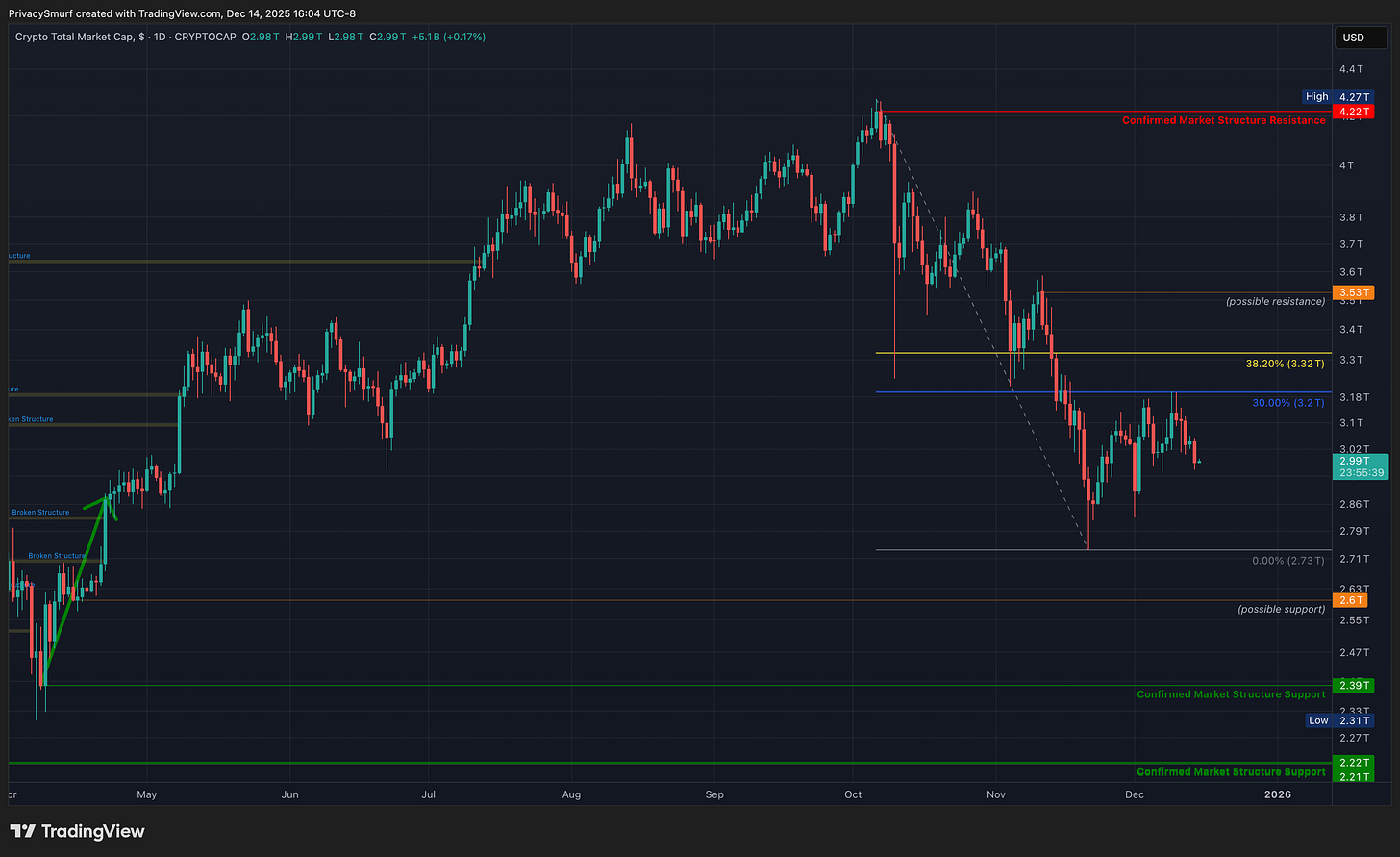 Bearish: A rally above $3.62T would give us structure support at the lowest close. Breaking below that after that support confirmation would flip the daily trend to bearish as it would create the traditional high, low, lower high, lower low zigzag shape (OCT high, potential low here, future lower high later, future lower low after that).