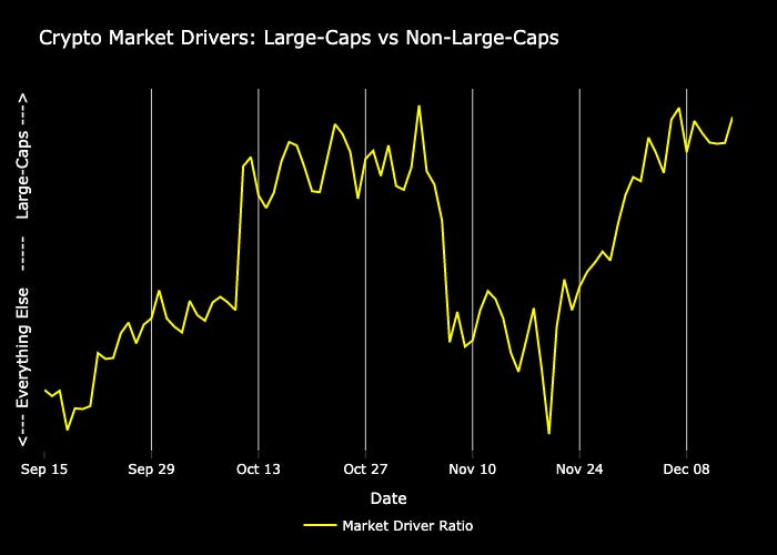 The Market Driver Ratio measures relative performance concentration among the top 100 cryptocurrencies by comparing market-cap-weighted performance with equally weighted performance.