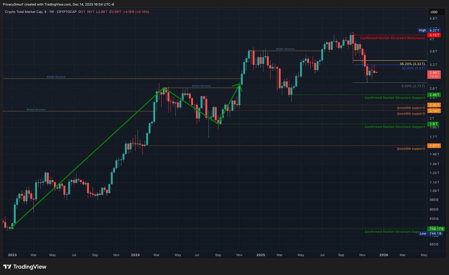 Bearish: Two bullish weeks and a rally above $3.32T would give us structure support at the lowest close. Breaking below that after that support confirmation would flip the weekly trend to bearish as it would create the traditional high, low, lower high, lower low zigzag shape.