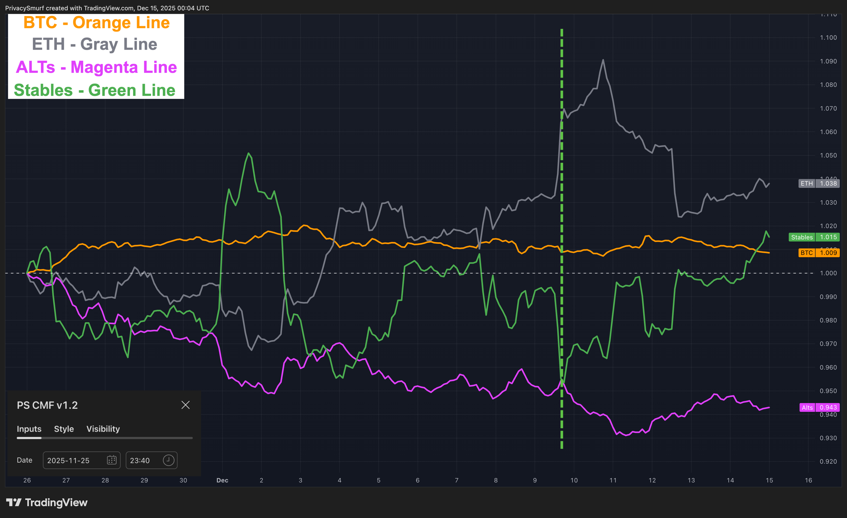 Observation: The original bottoming phase appears to be completed with a minor ETH rotation. BTS is now losing ground to Stables.