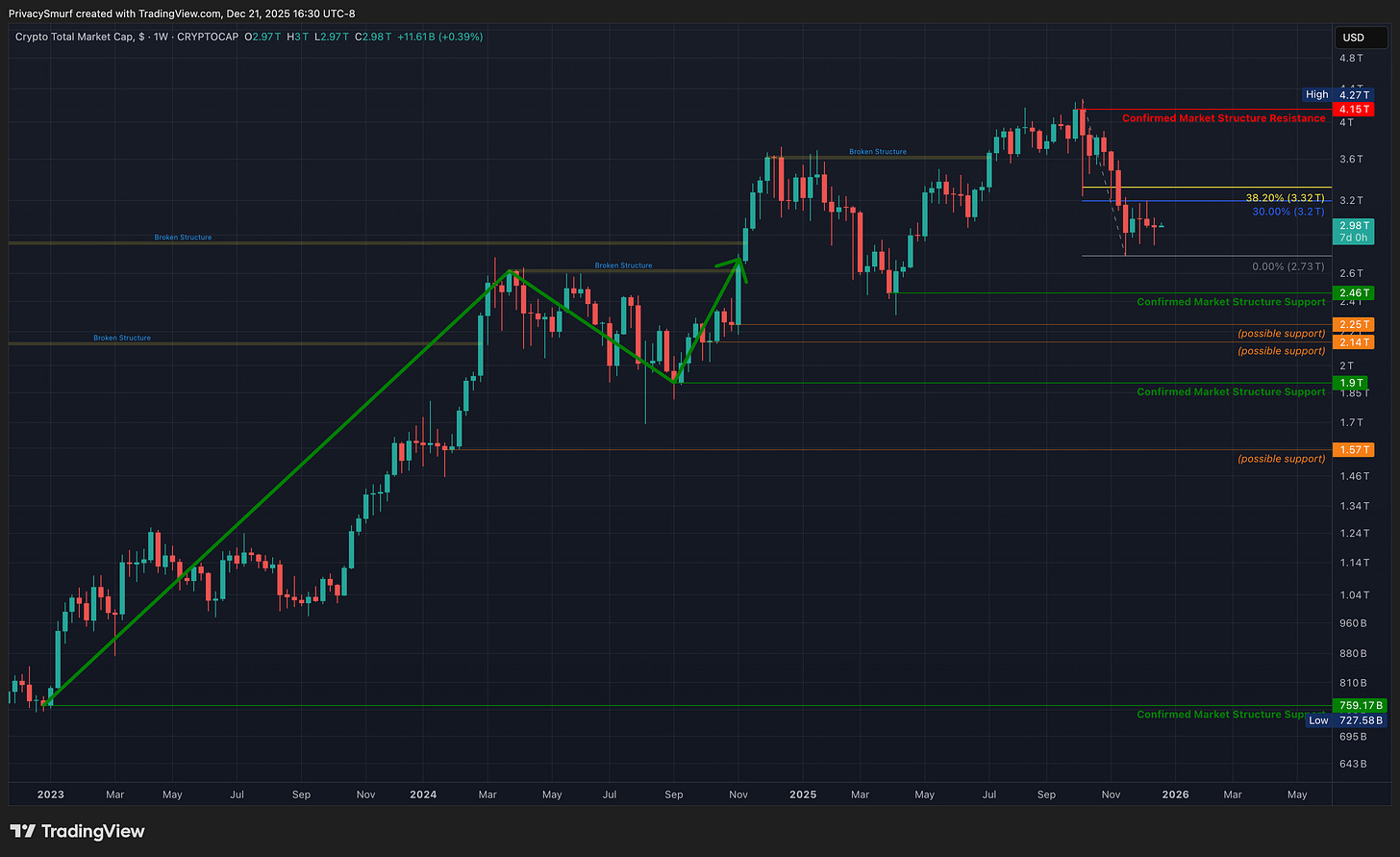 Bearish: Two bullish weeks and a rally above $3.32T would give us structure support at the lowest close. Breaking below that after that support confirmation would flip the weekly trend to bearish as it would create the traditional high, low, lower high, lower low zigzag shape.