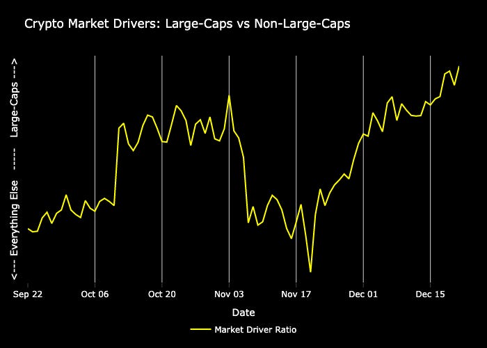 Large caps are still the primary drivers in the market. This is in anticipation of, and a precursor to, a bullish move, IMO. Breaking out on the chart would likely coincide with BTC making a new high after breaking out above $94K. If that doesn’t come this week, the odds increase that my expectation is incorrect and that this is protective movement out of ALTs, with the market turning down.