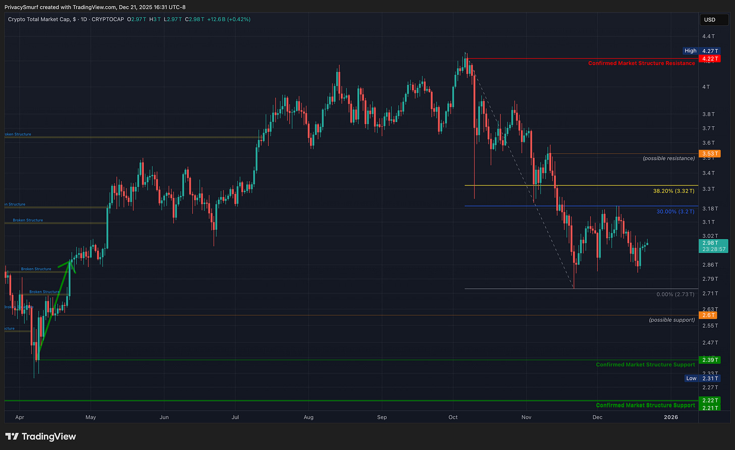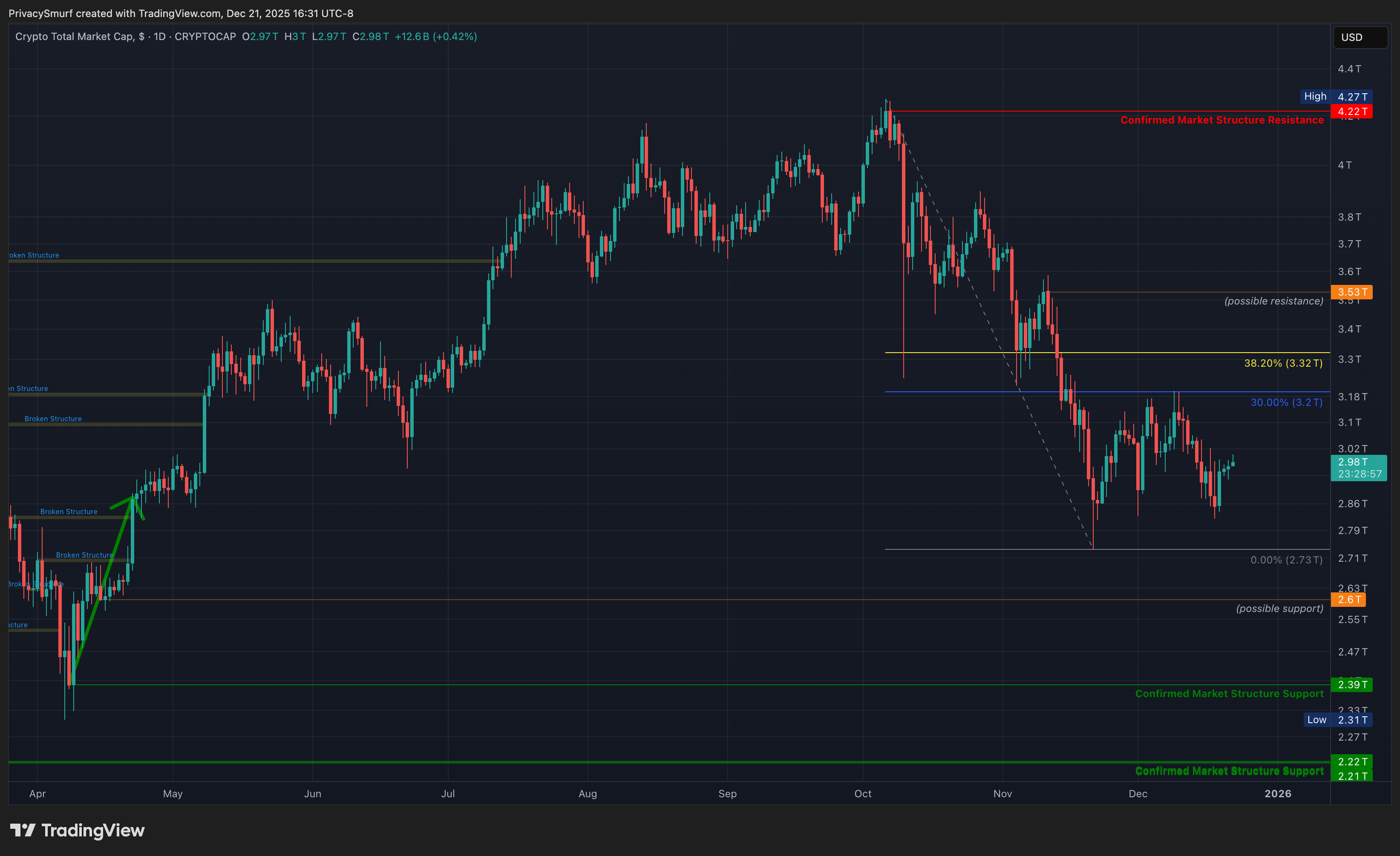 Confirmation Watch: Awaiting a close above $3.32T (at the time of writing) to confirm support.