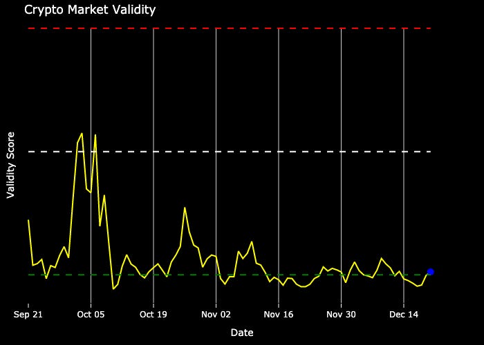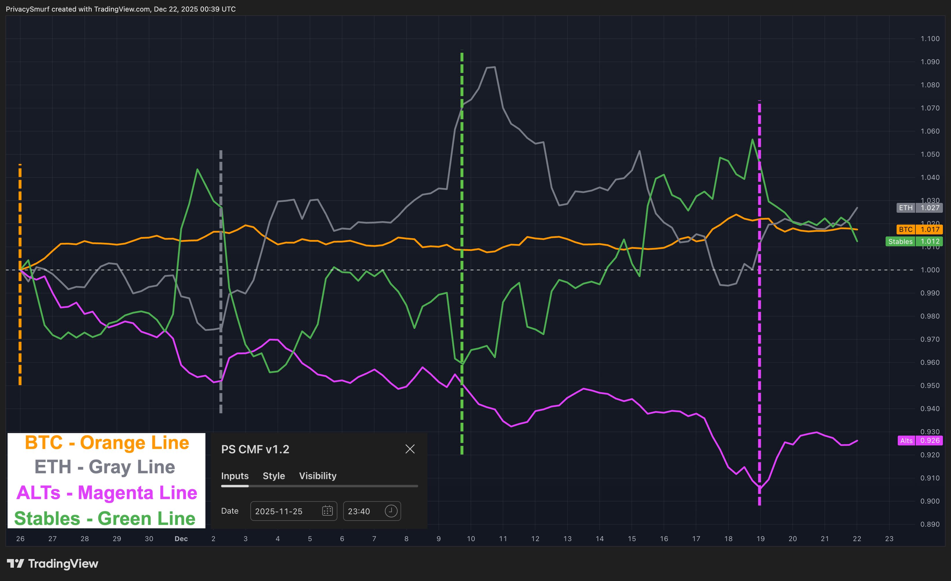 Interpretation: Our starting point still hasn’t changed. From the beginning to the end of the observed rotation, Bitcoin has steadily increased, with minor fluctuations. At the vertical gray dashed line, ETH spiked and has been slowly selling off as the Stables line began to grow. Near the end of the fuchsia vertical dashed line, ALTs and ETH have again started to increase their exposure. The worrisome part is that this could be a bounce into another lower high, followed by a rollover and market downturn.