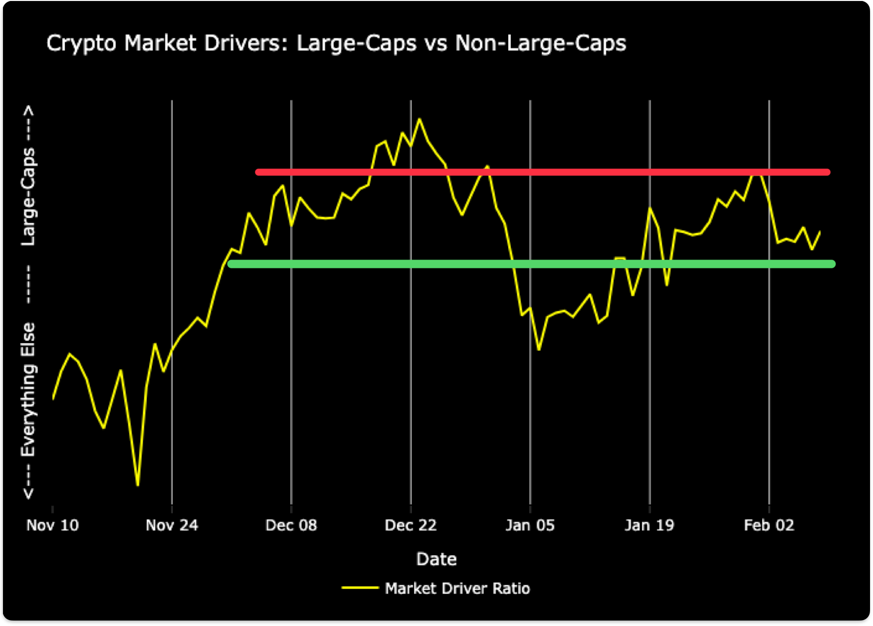 The Market Driver Ratio measures relative performance concentration among the top 100 cryptocurrencies by comparing market-cap-weighted performance with equally weighted performance.
