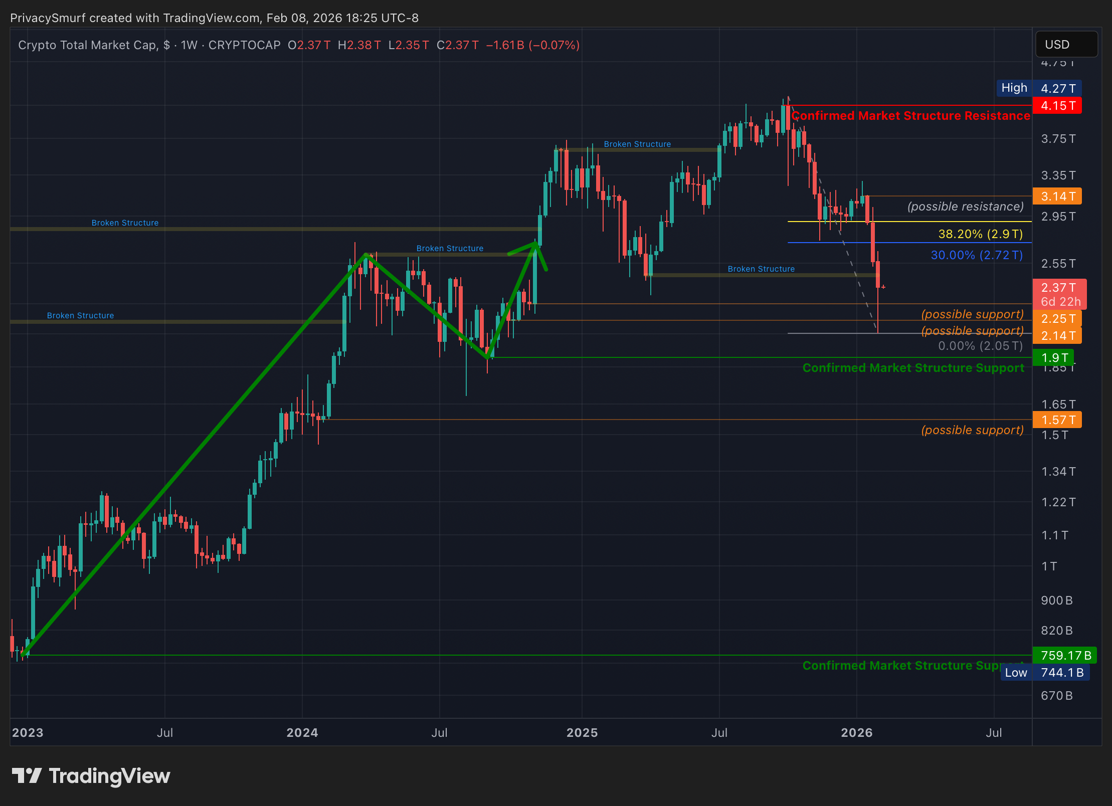 Bullish: Invalidated with the close below $2.46T. Must wait for more weekly structure to build out over time. We are now in a neutral market structure.