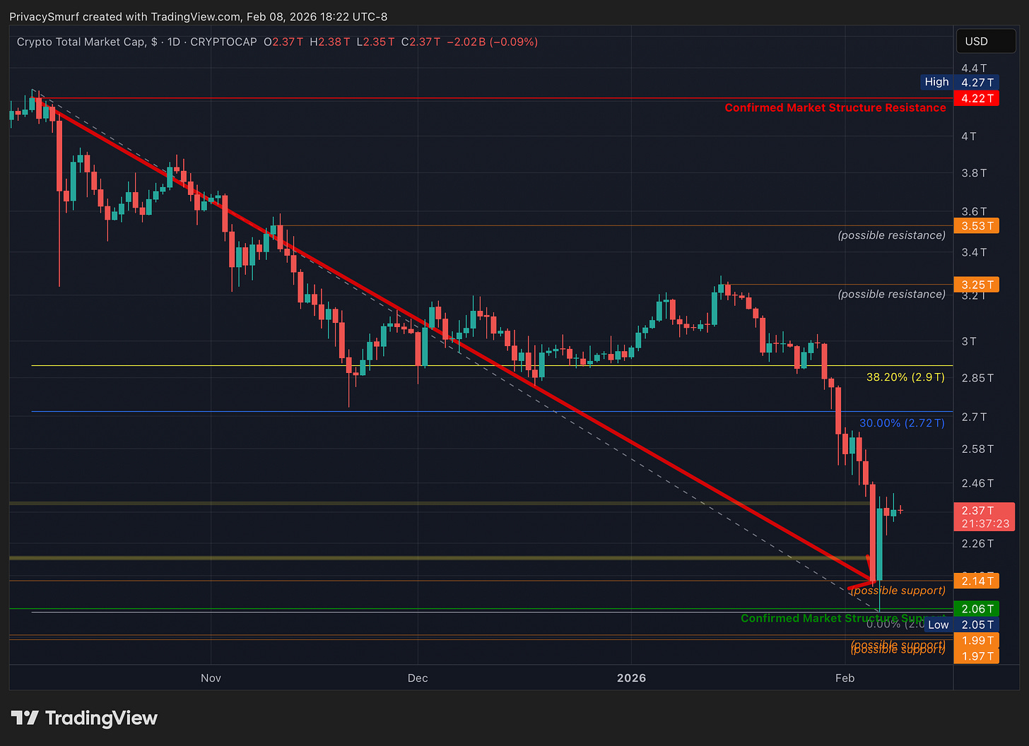 Bearish: Structural trend confirmed bearish after breaking the $2.39T and $2.21T supports.