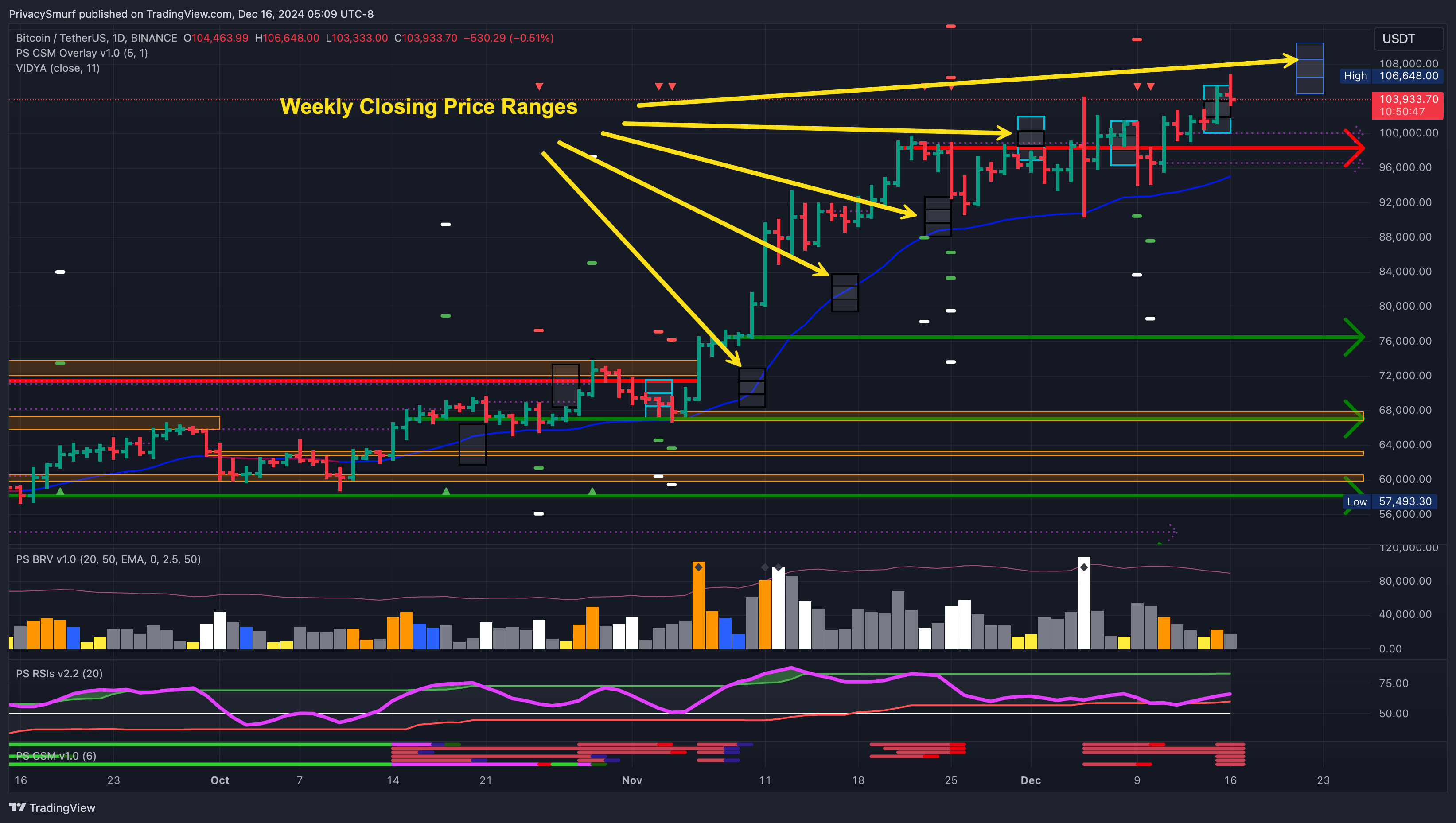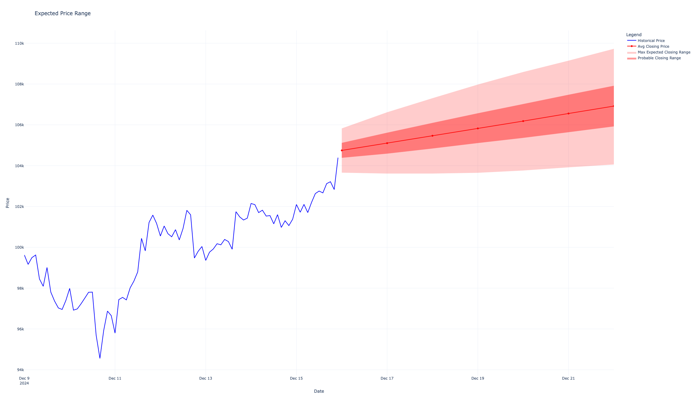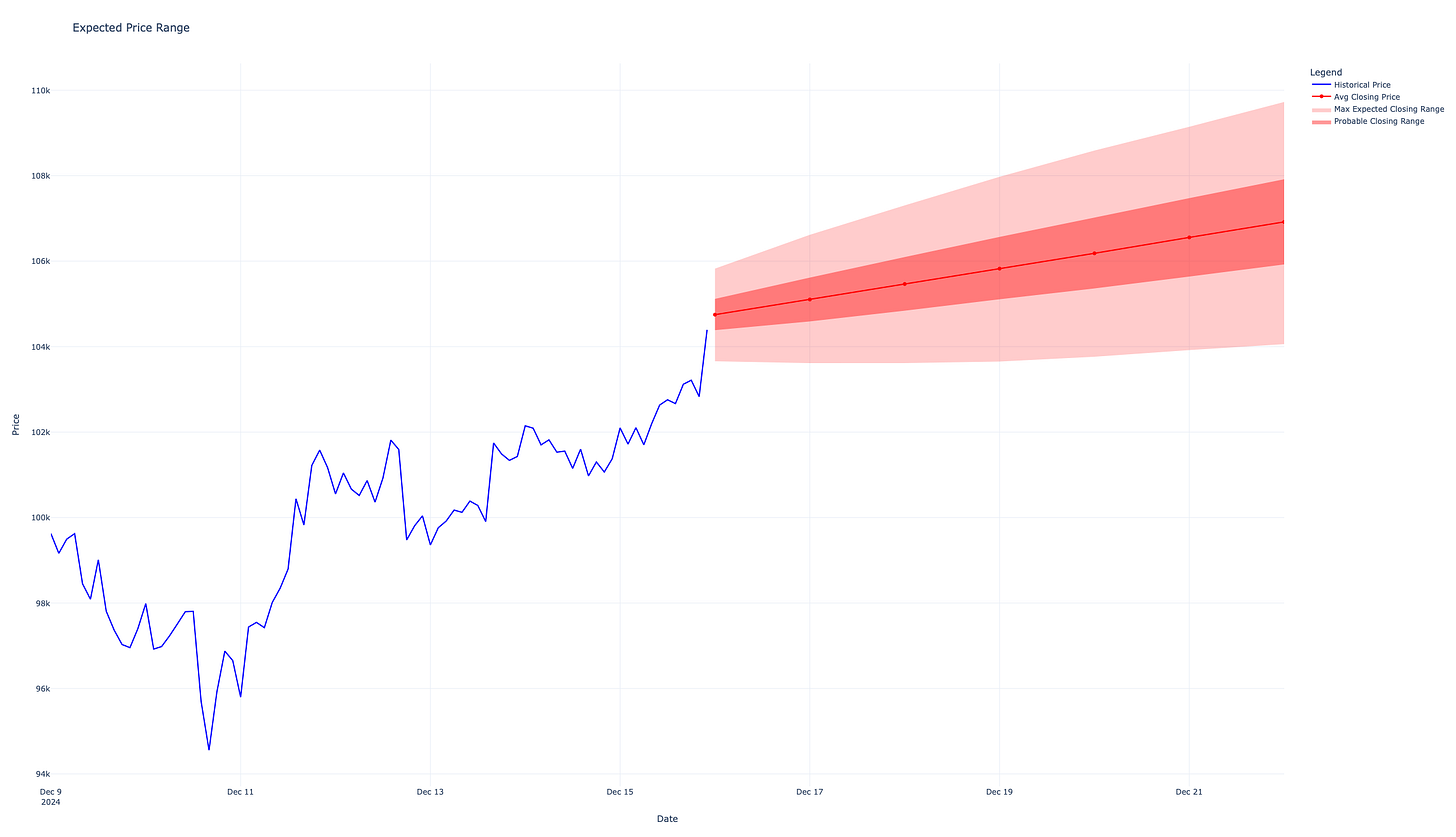 This would be expressed purely scientifically: “Given the current technicals, I can say with 95% confidence that the closing price for BTC this week will be between $104058.60 and $109726.06.”