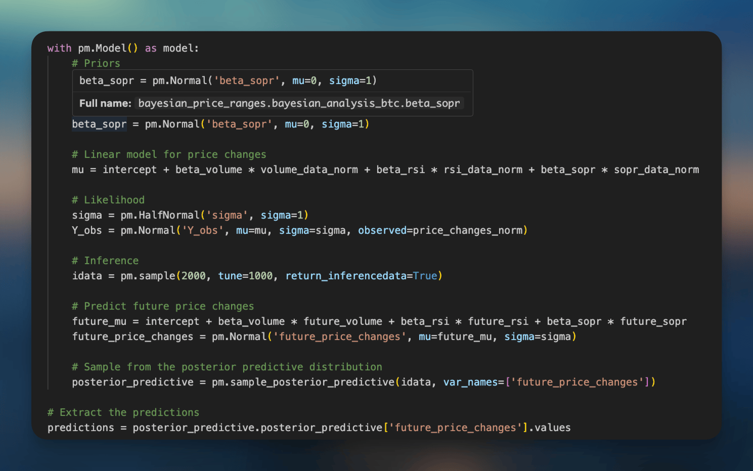 Then, I process the historical data through a Python package dedicated to statistical modeling, PyMC. I’m essentially using the history of the metrics above as prior knowledge, trying to determine how they interact to create a possible future, given what metrics look like now.